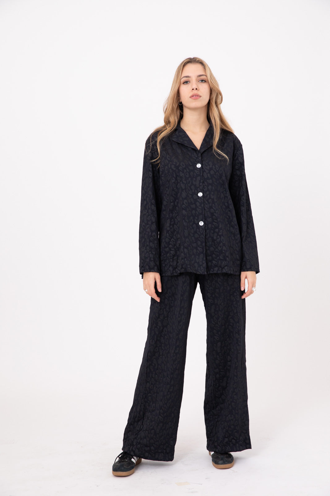 Black Notch Collar Shirt with Leopard-Embossed Pattern